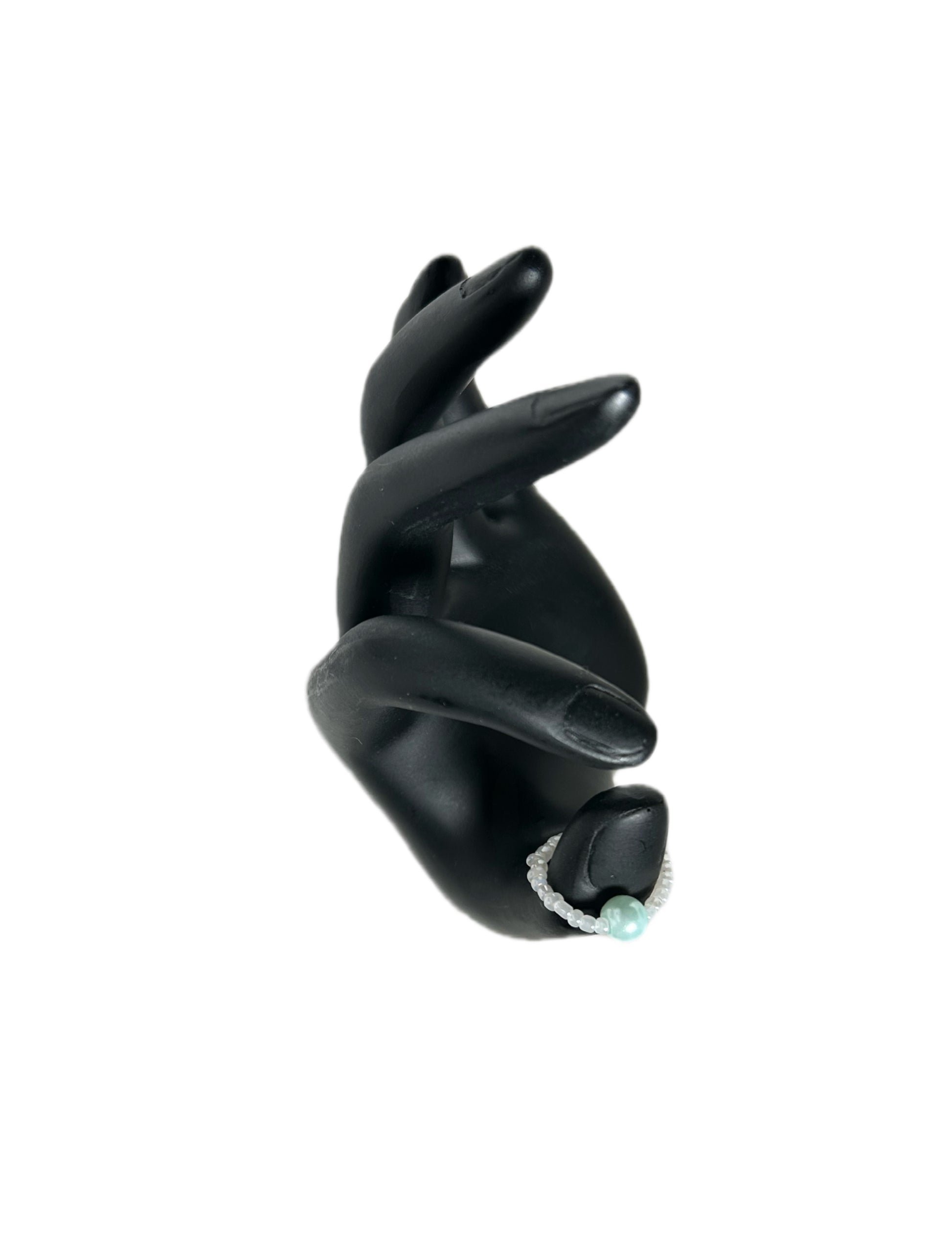 A beaded ring crafted from opaque white lustre seed beads with a light teal pearl ant the center adding a gentle wash of color that contrasts beautifully with the milky white beads. The combination creates a fresh, airy look that feels calm and elegant. The subtle shine of the beads enhances the pearl’s soft teal hue, giving the ring a refined yet playful charm—perfect for everyday wear, stacking, or adding a cool, serene accent to an outfit.